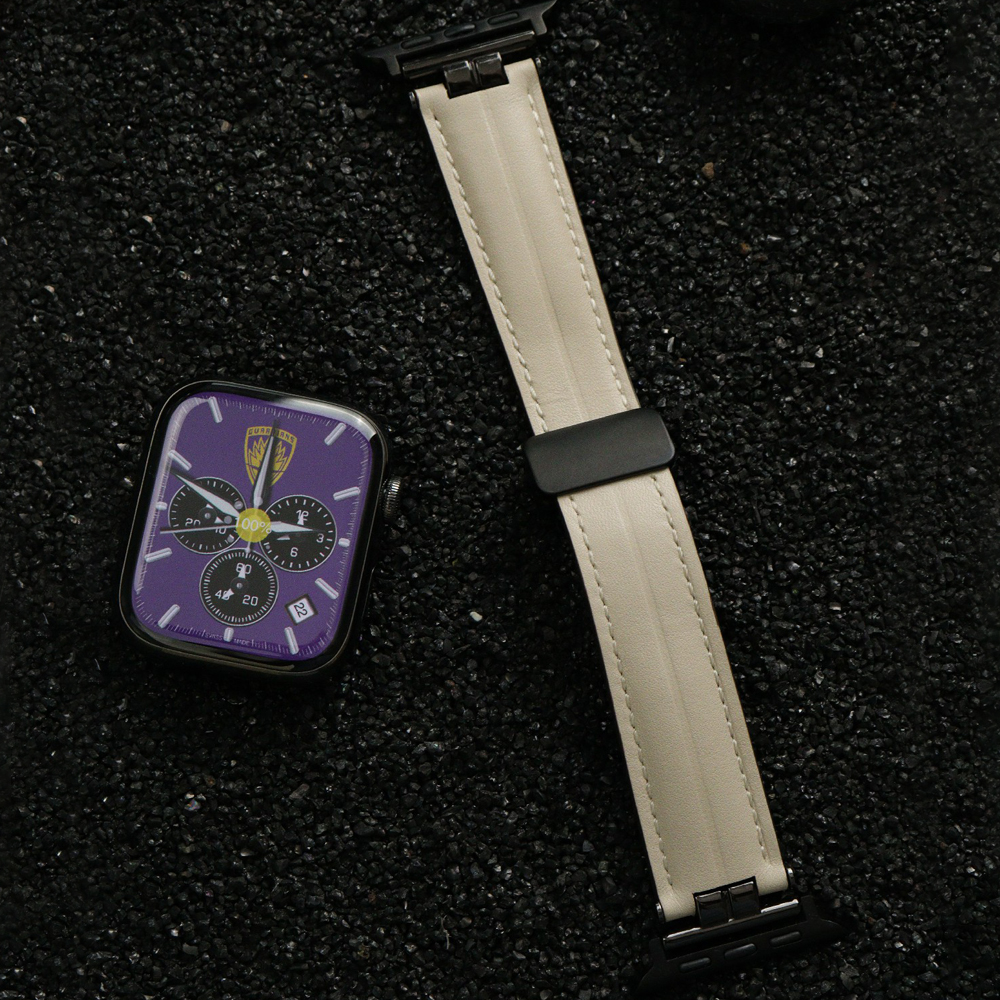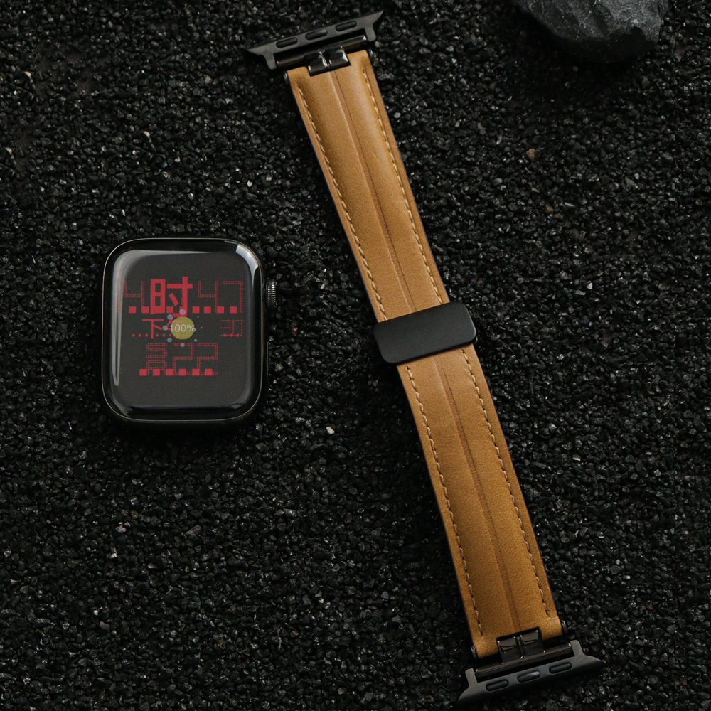 Made from fine calf leather and complemented by a matte black magnetic clasp, this Apple Watch band captures understated luxury. The smooth rounded edges and tone-on-tone saddle stitching add refined detail, perfect for those who favor a minimalist yet timeless aesthetic.