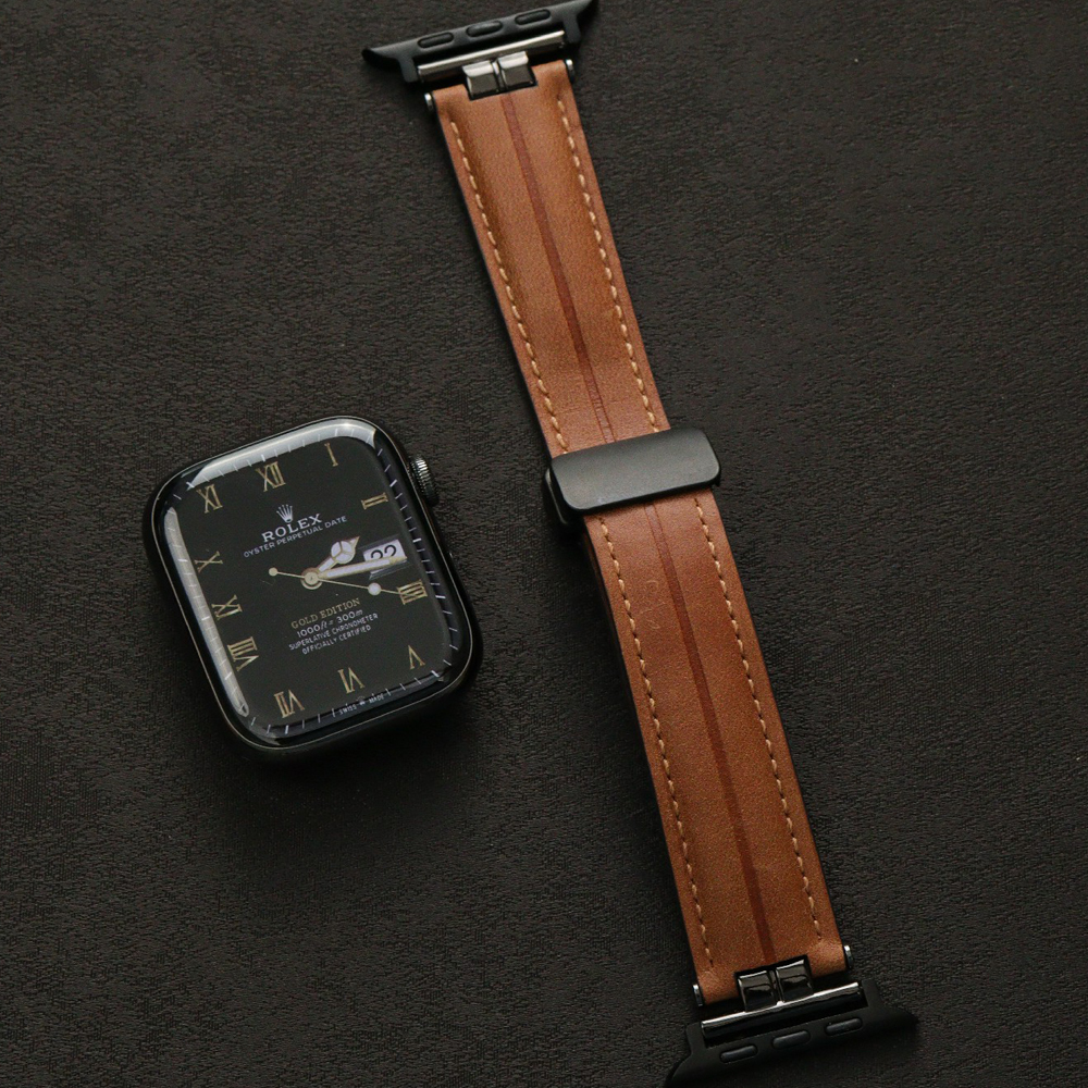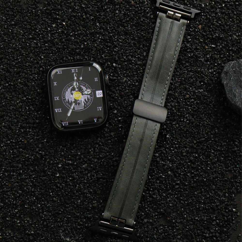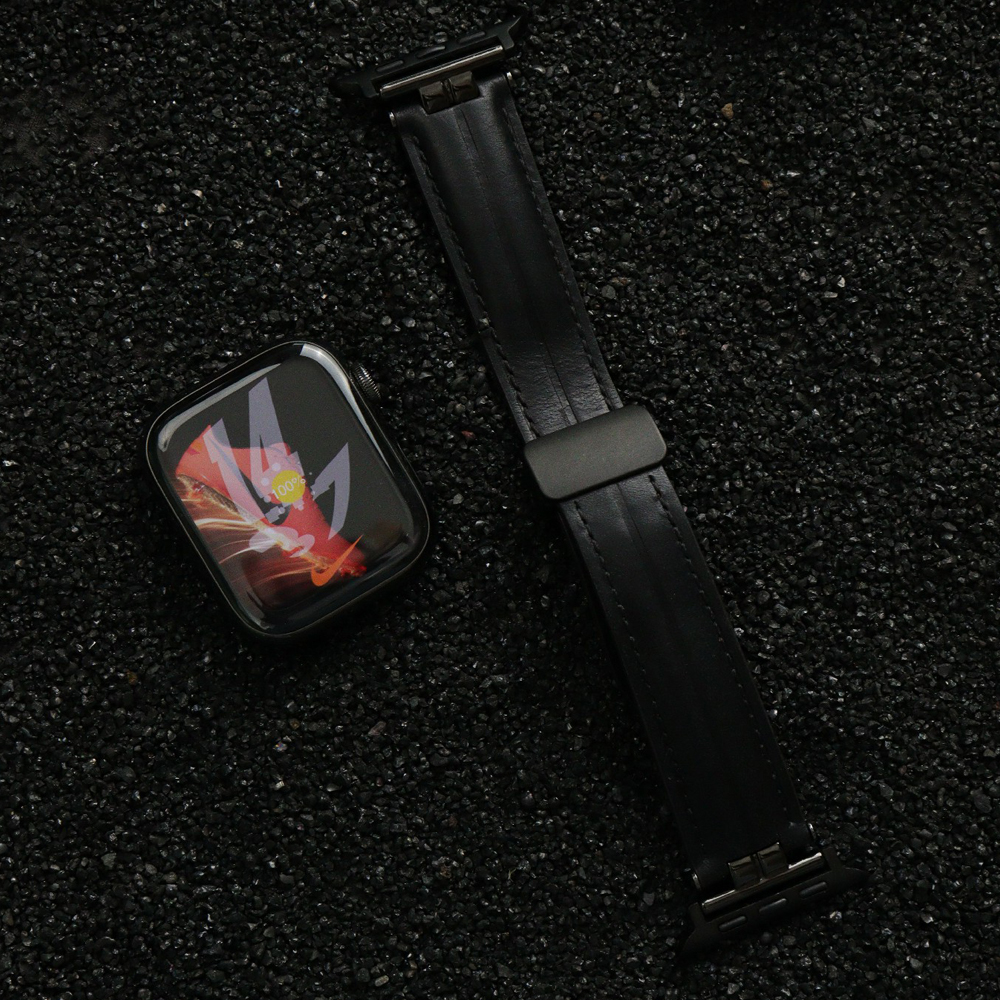 Crafted from premium calf leather with a matte black magnetic clasp, this Apple Watch band blends timeless elegance with minimalist sophistication.