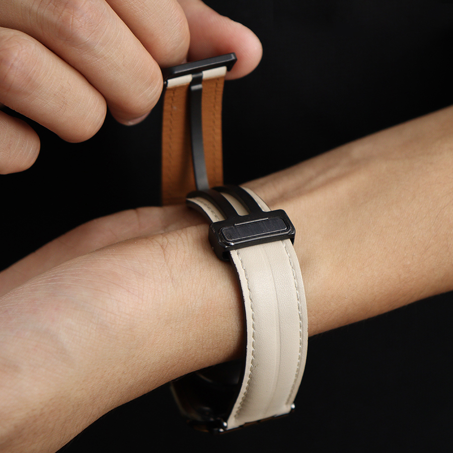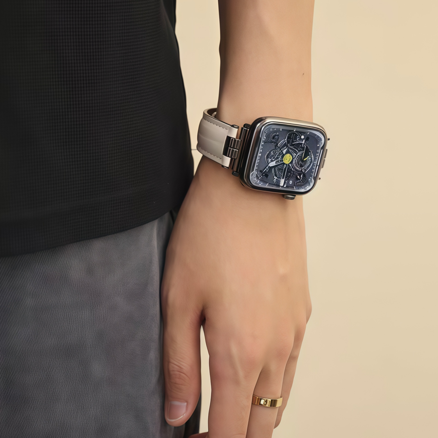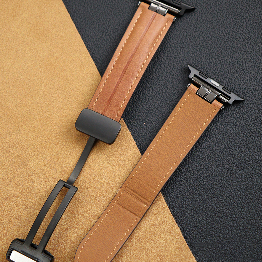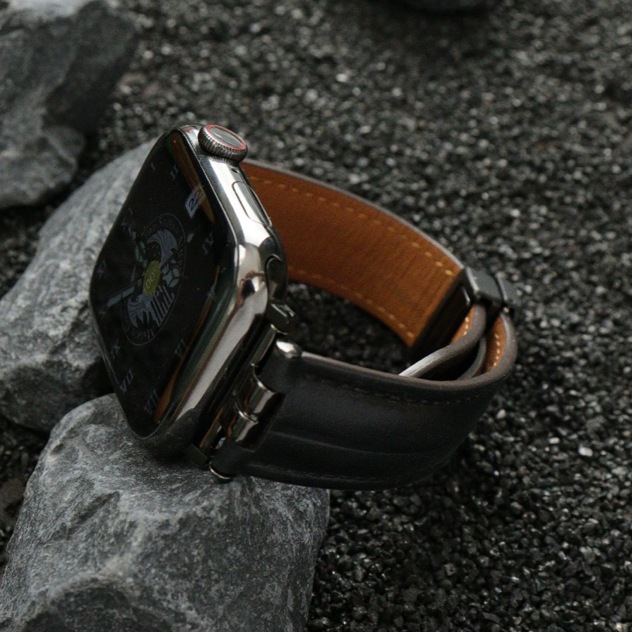 Crafted from premium calf leather with a matte black magnetic clasp, this Apple Watch band blends timeless elegance with minimalist sophistication.