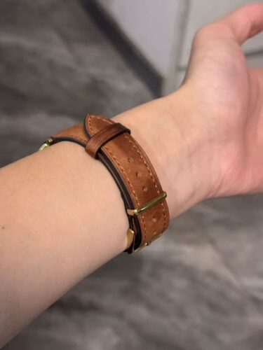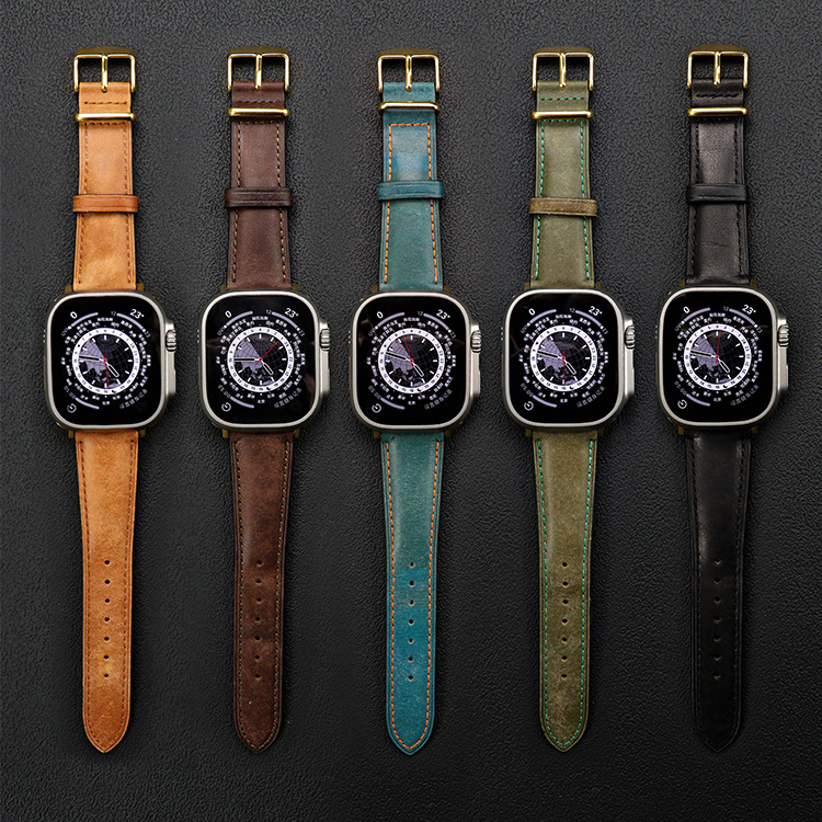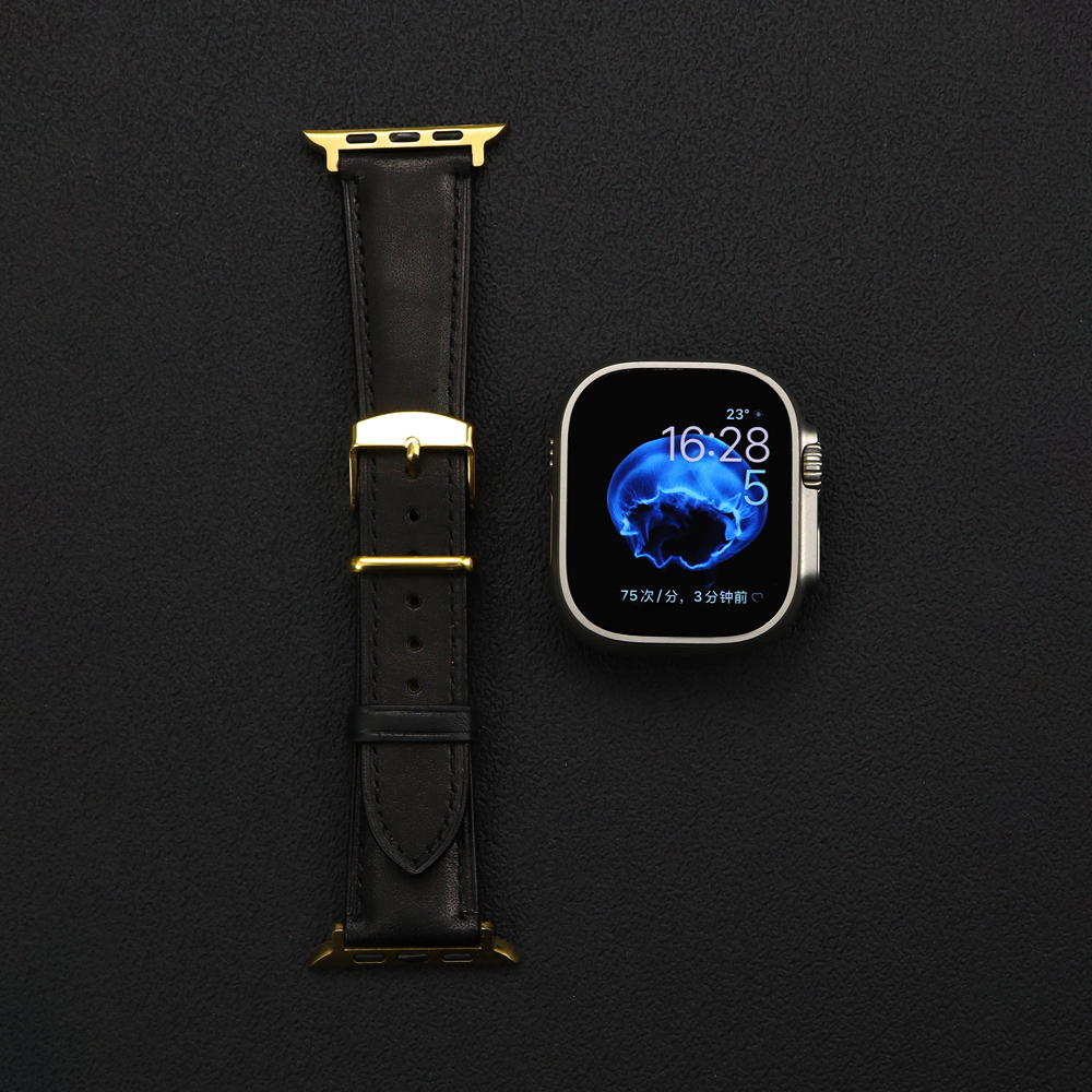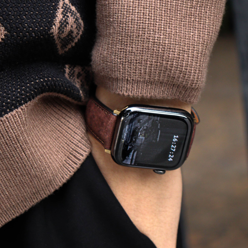 This Apple Watch band is crafted from premium top-grain calfskin with a refined distressed texture, offering a touch of vintage charm and sophistication. The precise saddle stitching enhances durability, while the polished metal hardware and rounded edges reflect elegant minimalism—a classic design for those who appreciate understated luxury.