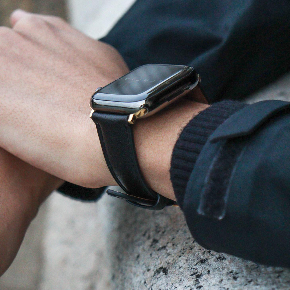 Crafted from top-grain calfskin with a subtle distressed finish, this Apple Watch band blends timeless craftsmanship with modern minimalism. Detailed with saddle stitching and polished metal hardware for a refined look.