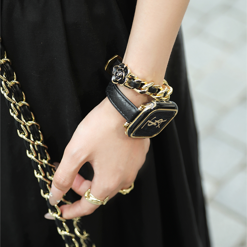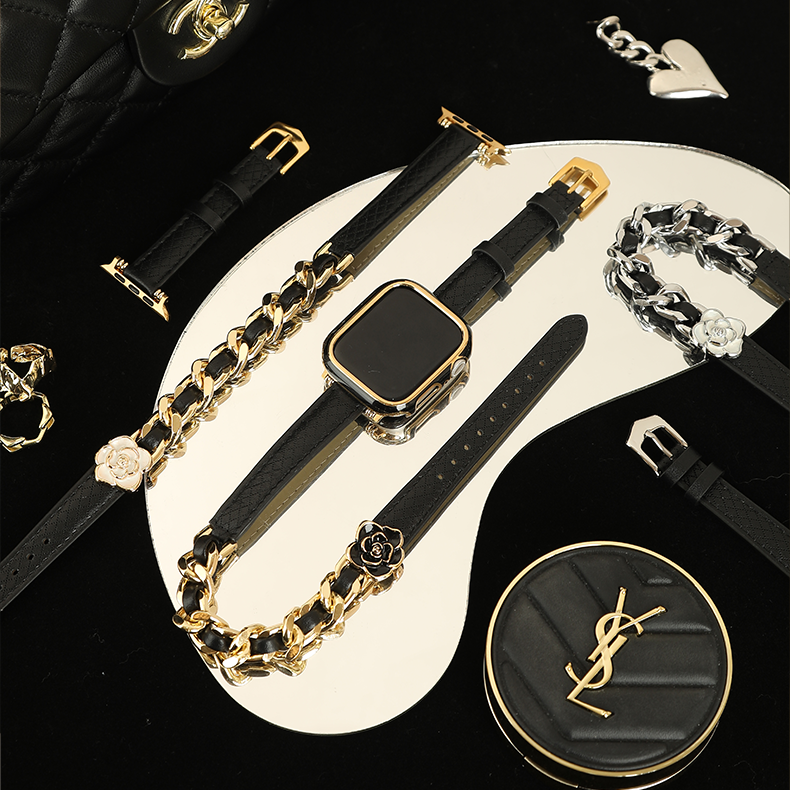 This Apple Watch band blends the elegance of full-grain cowhide and calf leather with a unique Bougie strap design. The interwoven calf leather and metal chain, camellia flower accent, and polished square buckle add a touch of sophistication. With matching saddle stitching and smooth edges, this band offers a refined, youthful look that embodies timeless style and modern chic.
