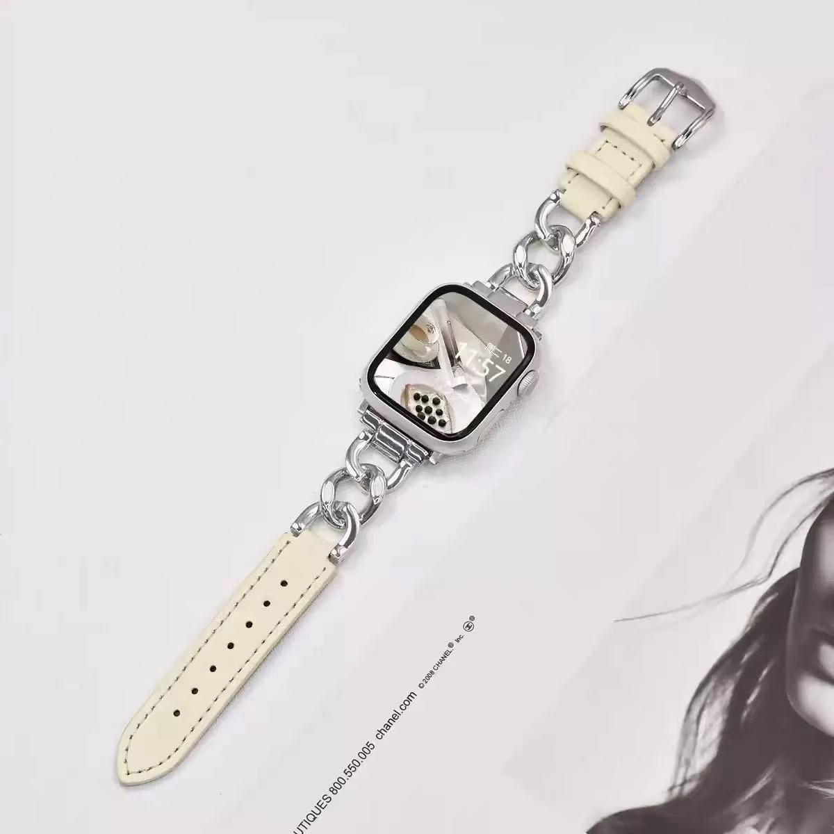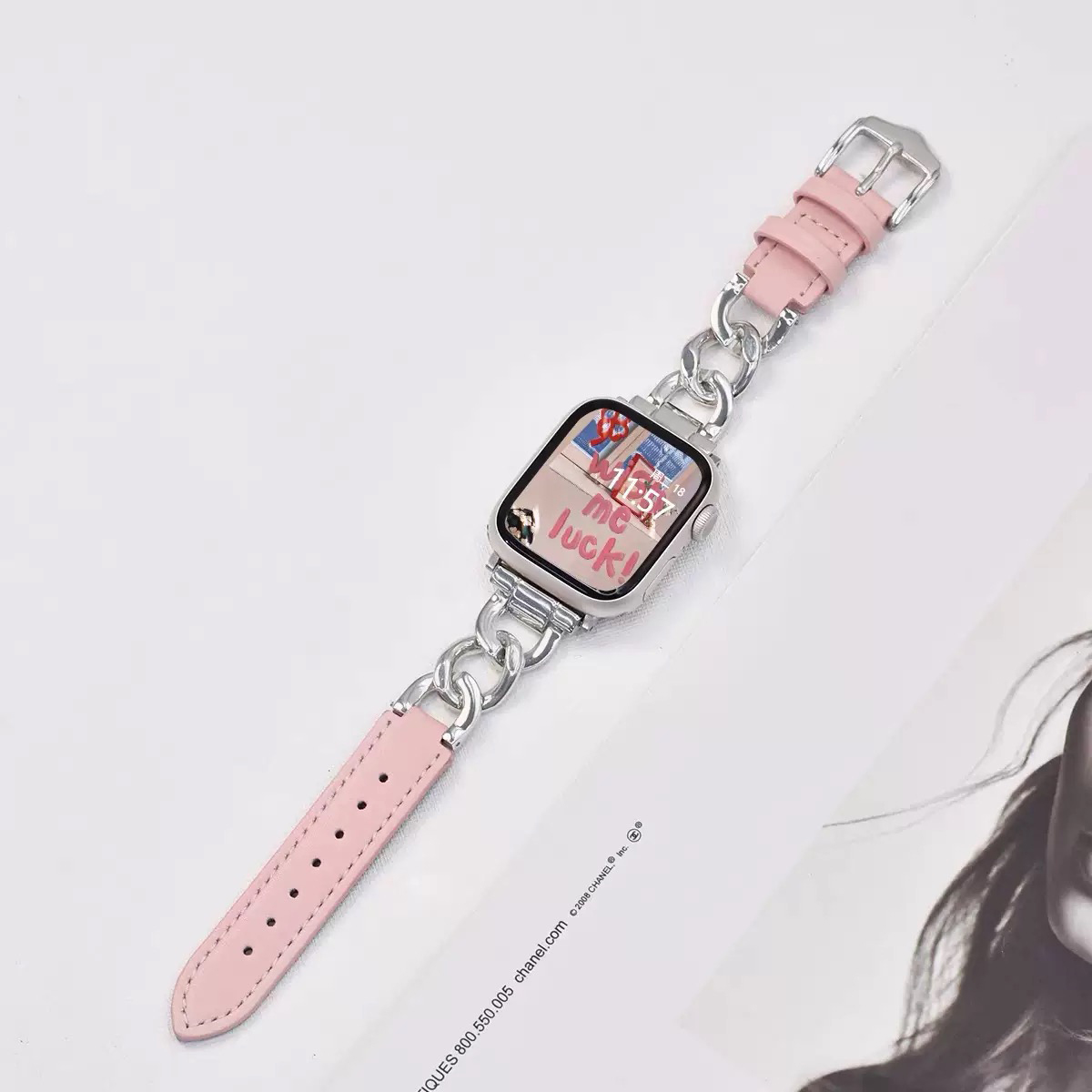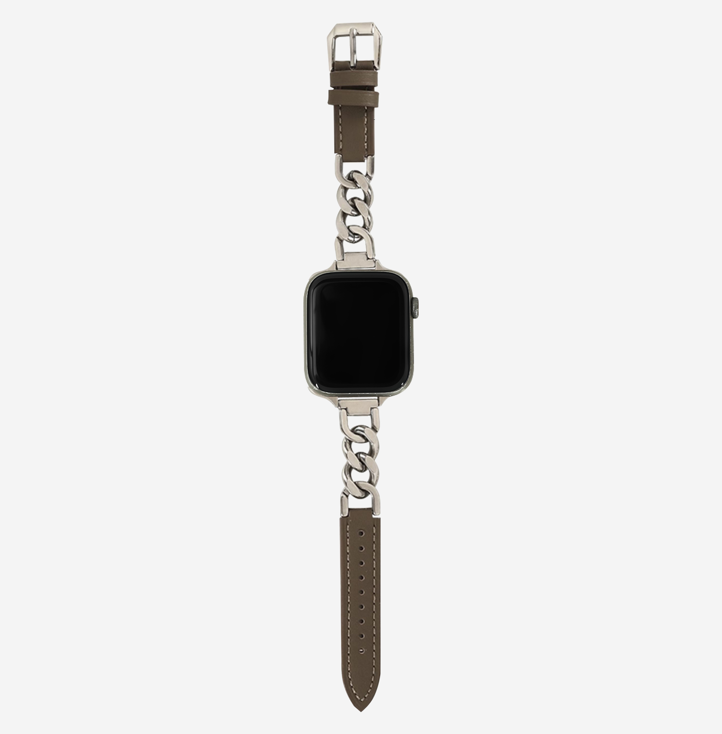 This Apple Watch band blends luxurious full-grain cowhide with a polished metal chain, featuring matching saddle stitching and a square pin buckle. The smooth rounded edges and clean design create a modern, minimalist aesthetic, making it the perfect accessory for those who appreciate both elegance and simplicity.