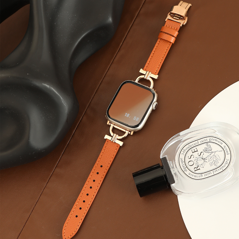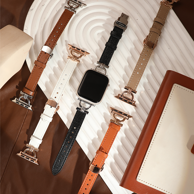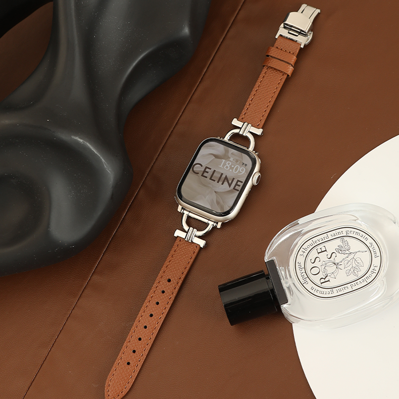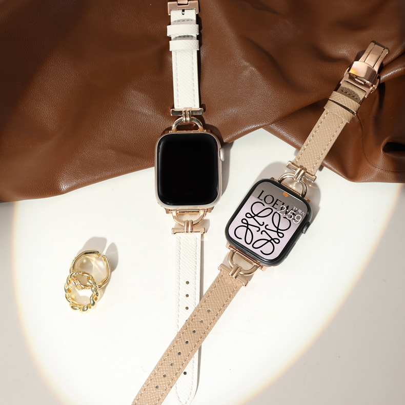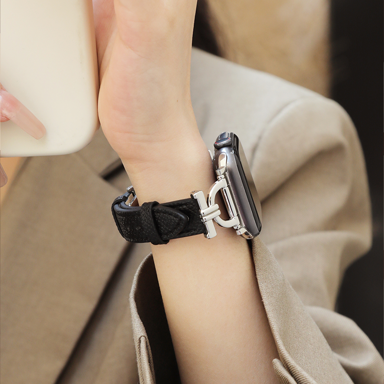 This Apple Watch band showcases the elegance of old money style with its full-grain litchi leather, featuring refined saddle stitching, a polished metal D-ring, and a double-press butterfly clasp. The sleek rounded edges and polished finish elevate the design, making it perfect for those who appreciate timeless luxury and sophisticated fashion.