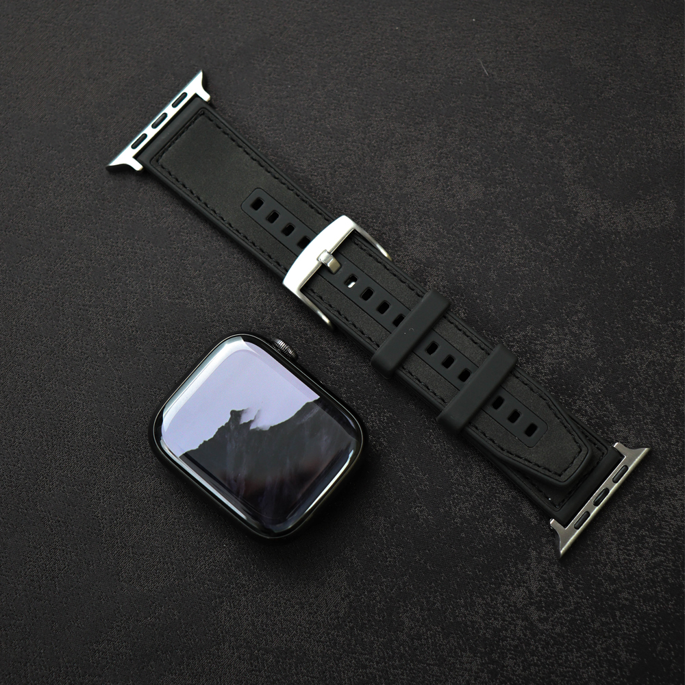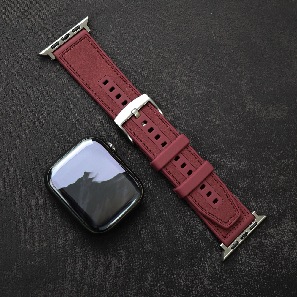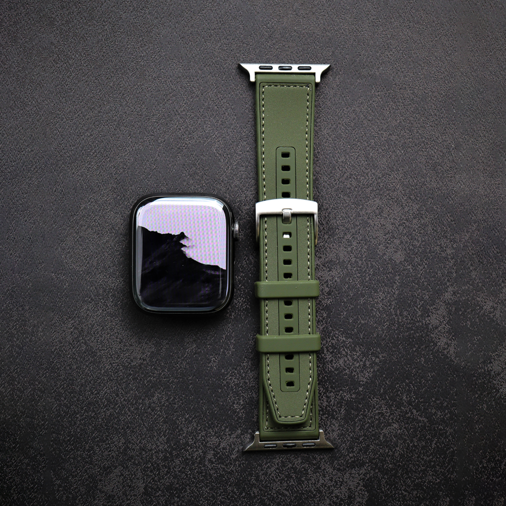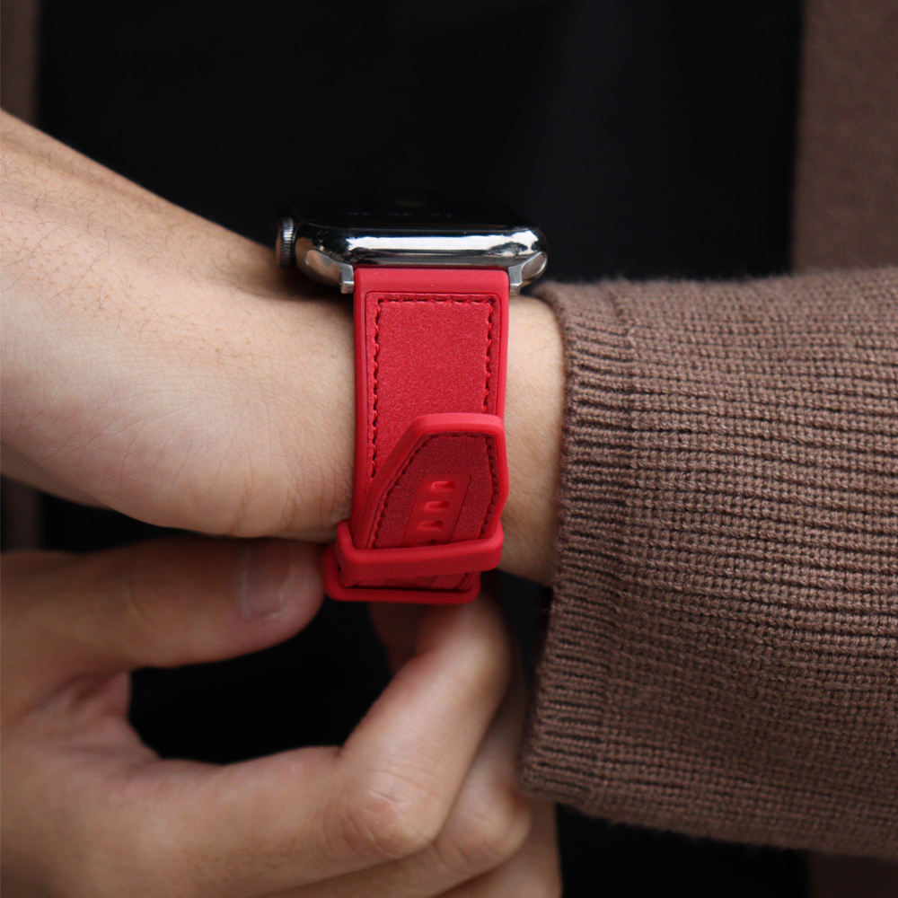 This Apple Watch band is crafted from premium dust-resistant silicone with a soft matte finish, accented by fine saddle stitching and a polished square buckle. The rounded edges enhance comfort, while the minimal design exudes effortless sophistication. A perfect choice for those who seek a niche yet modern aesthetic that balances practicality with quiet elegance.