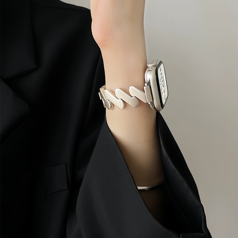 This Apple Watch band showcases a sculptural Mobius-inspired stainless steel design, symbolizing continuity and modern elegance. The fluid form and polished surface create a sophisticated minimalist aesthetic that complements any outfit. Designed for those who appreciate understated refinement and unique artistic expression in their accessories.