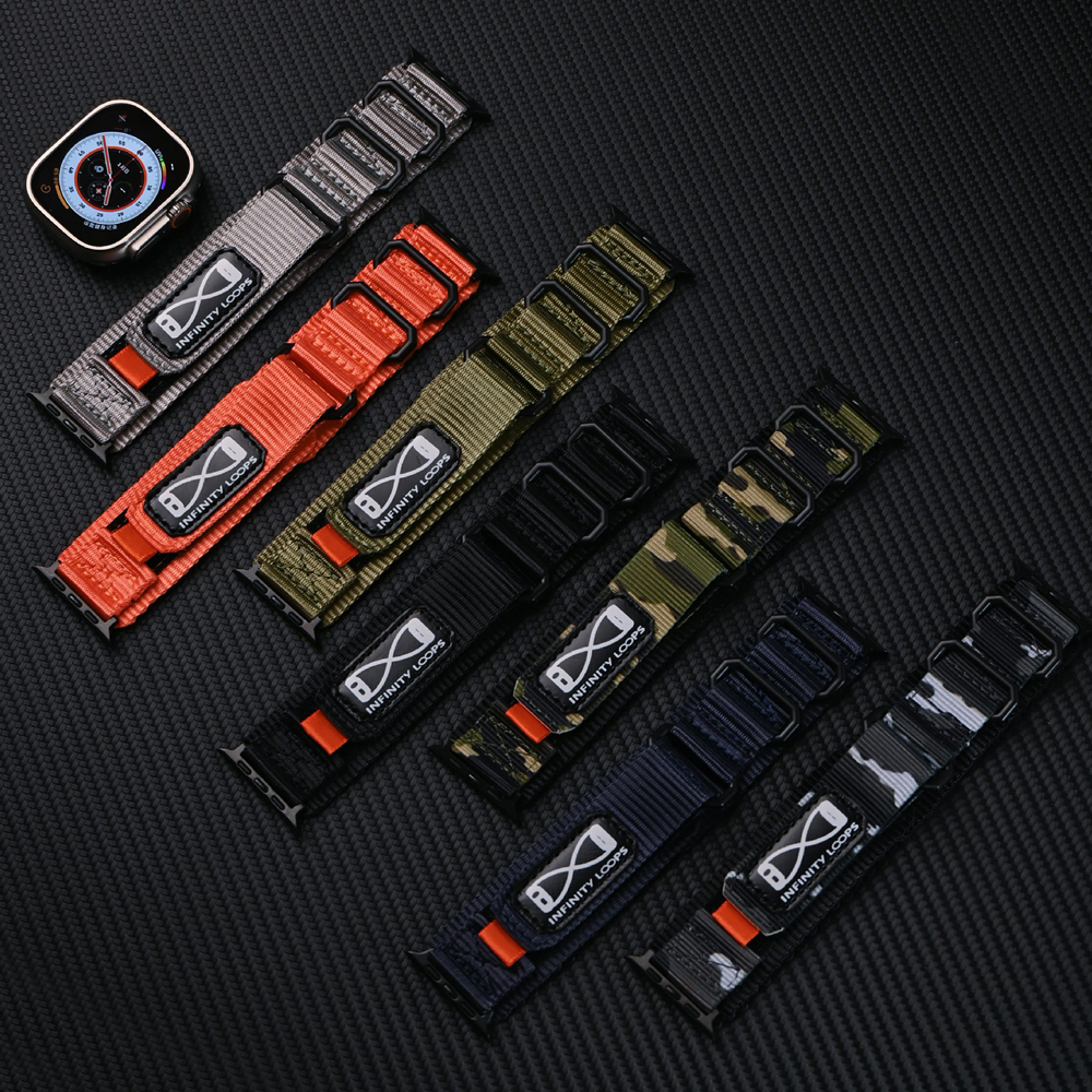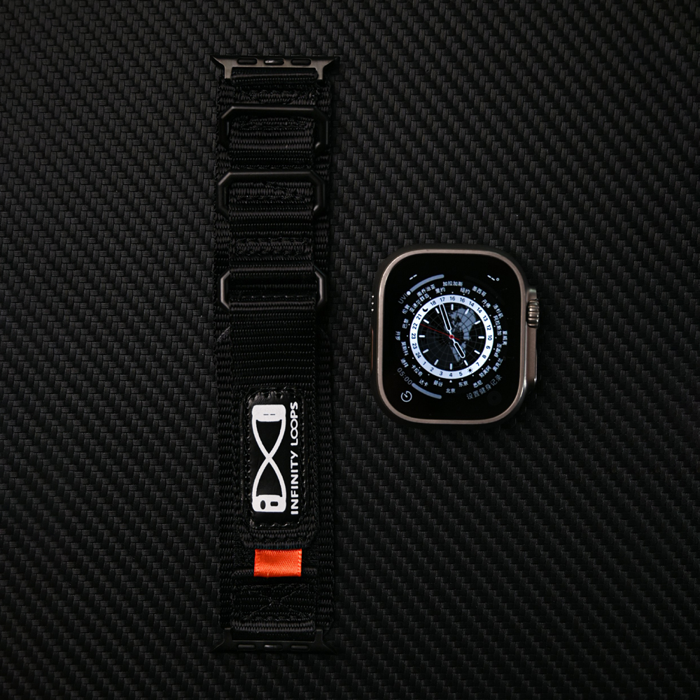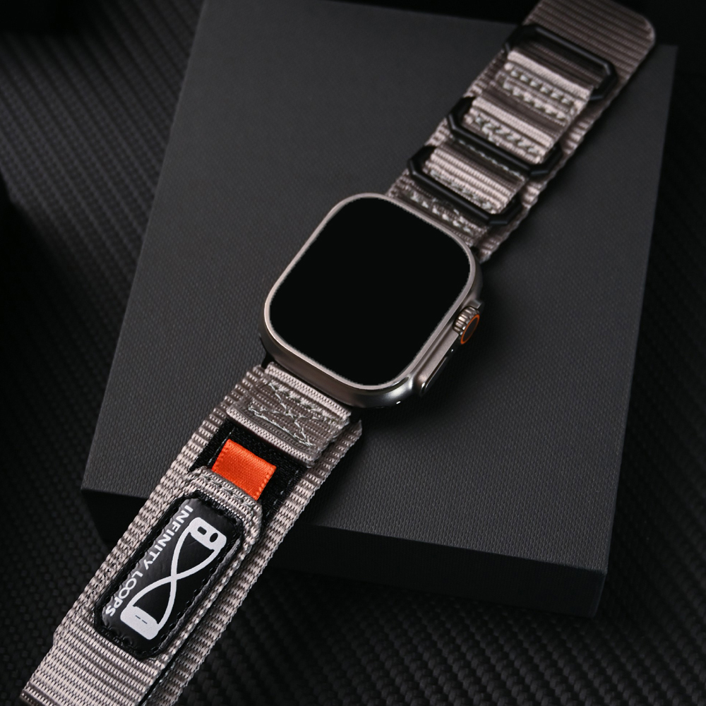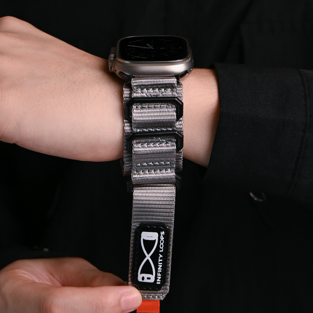 Crafted from tough nylon with matte black metal loops, this Apple Watch band combines outdoor utility with modern style. Its multi-ring design and subtle contrast accents make it a perfect pick for those who value understated individuality.