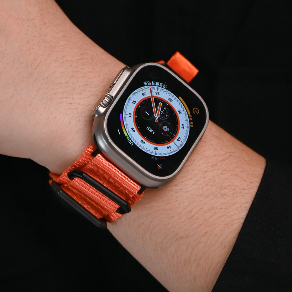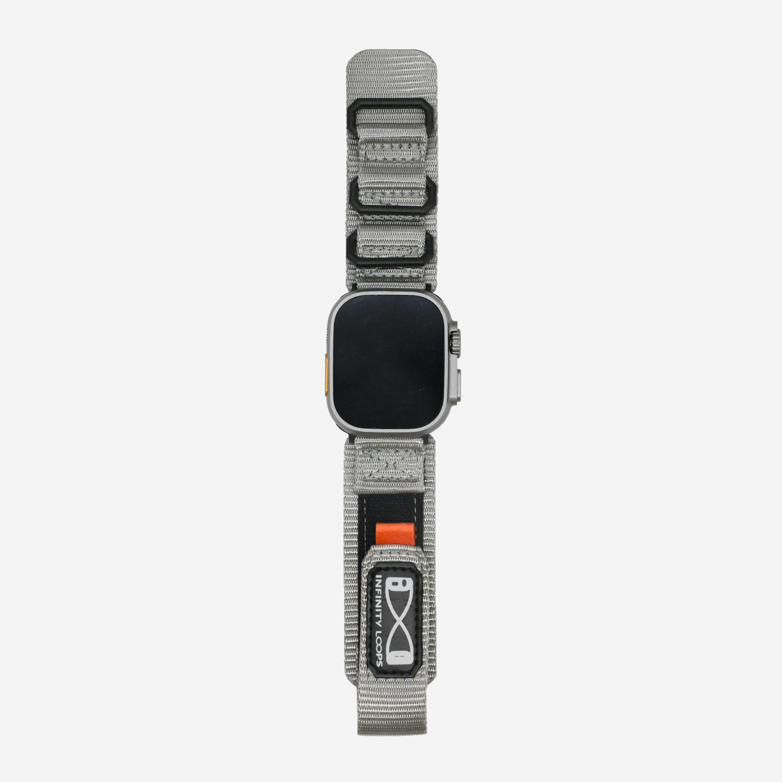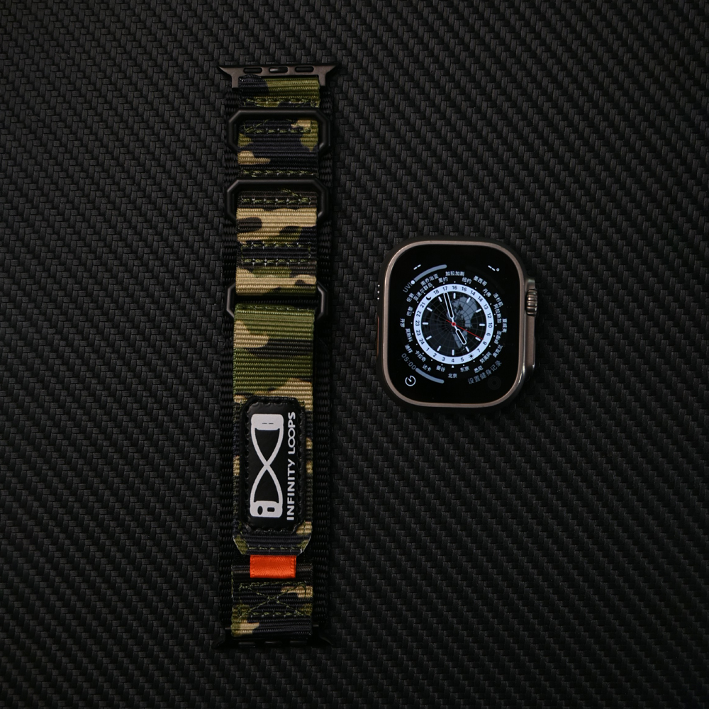 Crafted from tough nylon with matte black metal loops, this Apple Watch band combines outdoor utility with modern style. Its multi-ring design and subtle contrast accents make it a perfect pick for those who value understated individuality.