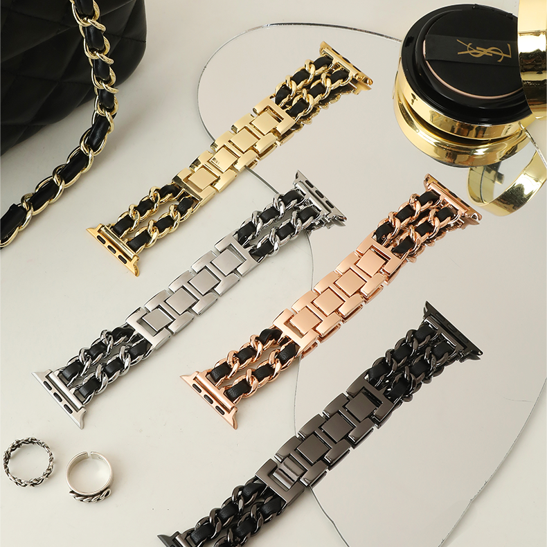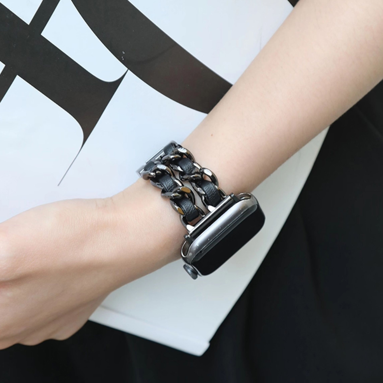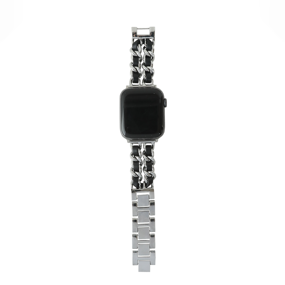 Crafted from full-grain cowhide and stainless steel, this Apple Watch band features an interwoven leather and metal design with a removable clasp, offering a refined, minimalist look.