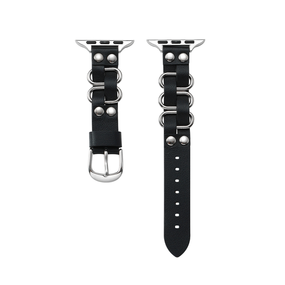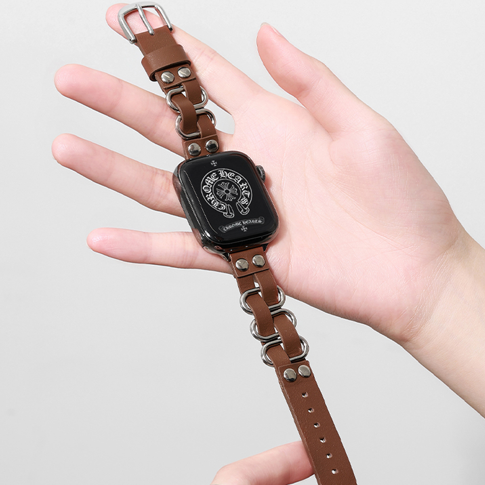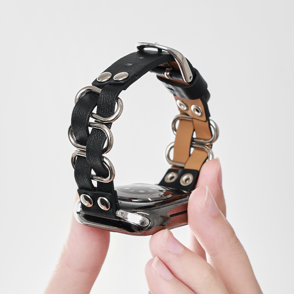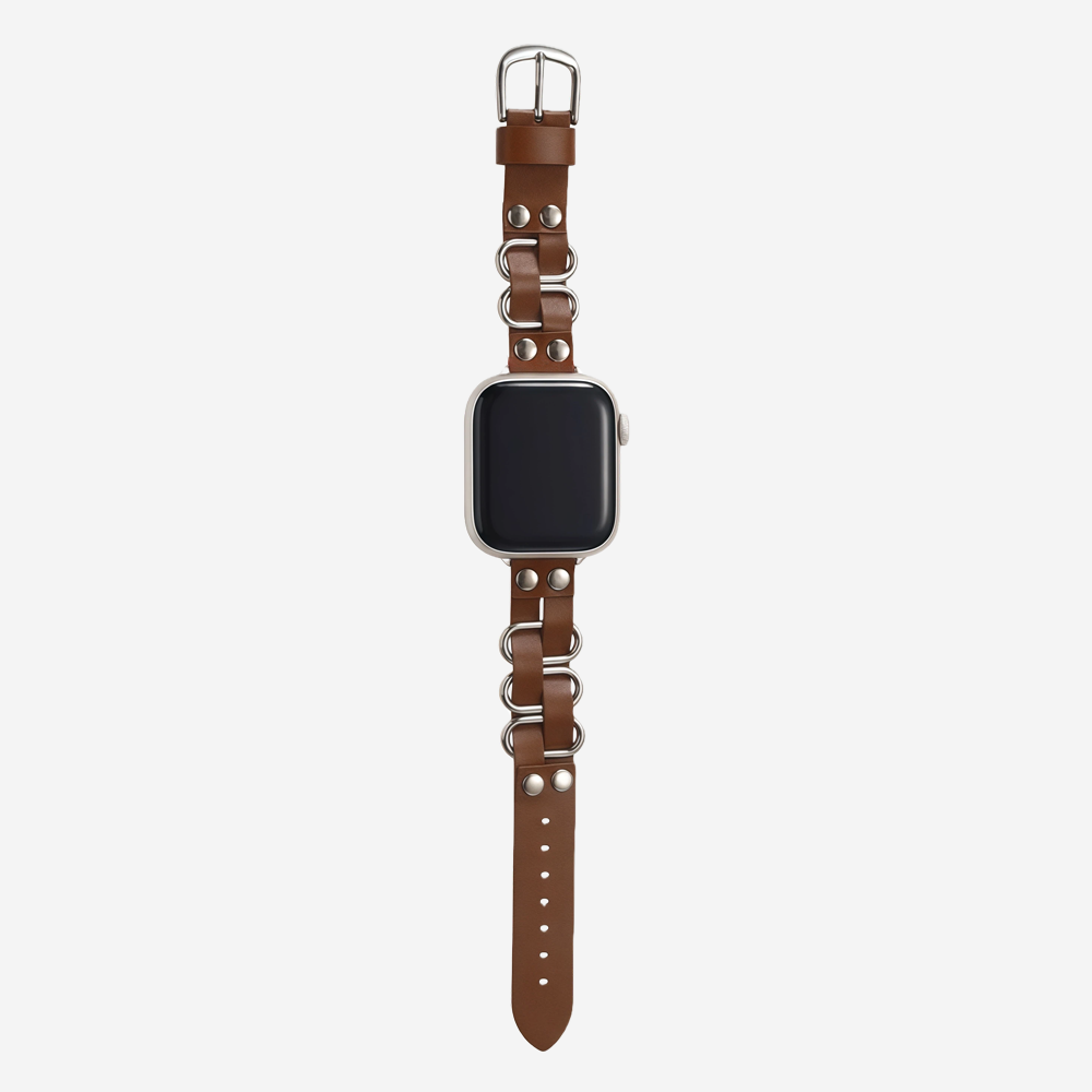Crafted from full-grain cowhide and polished metal, this Apple Watch band features an interwoven leather and metal design, metal round studs, and a square pin buckle for a sophisticated old money style.