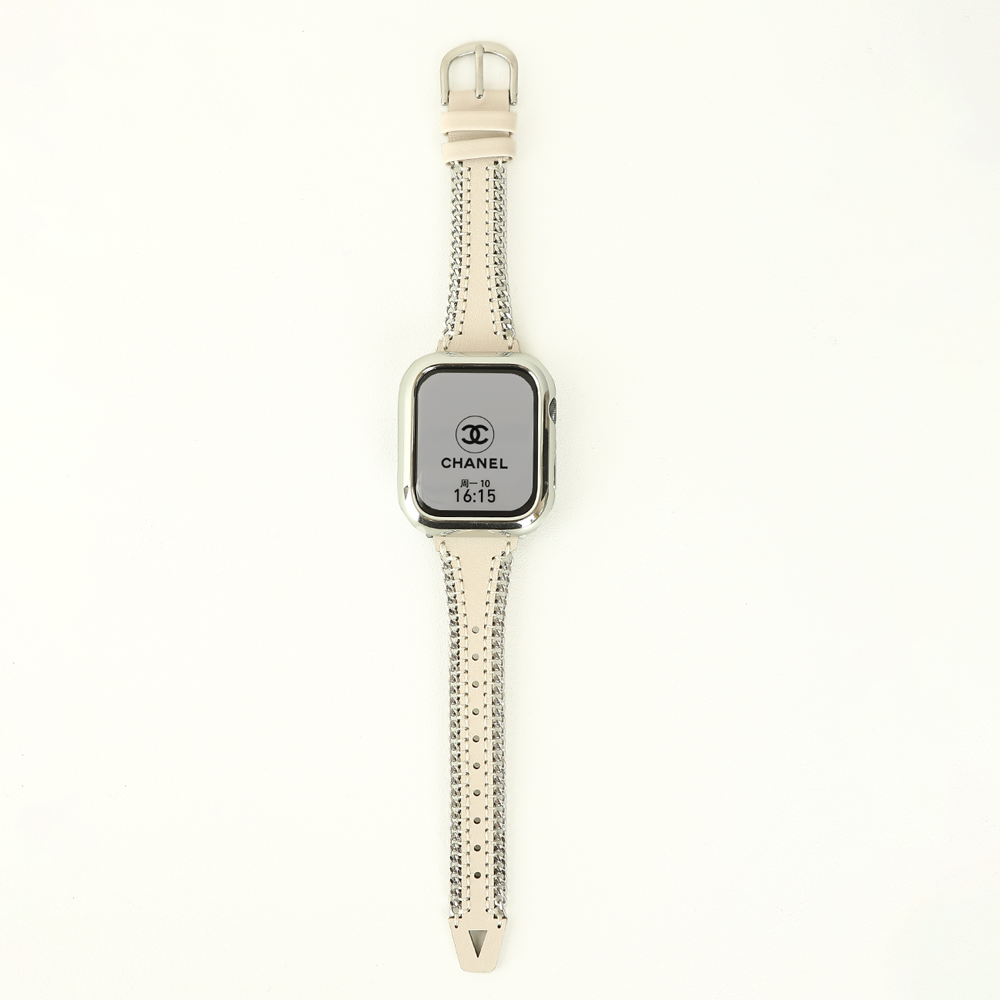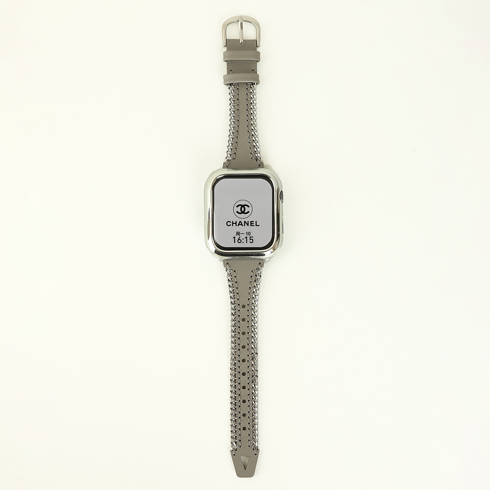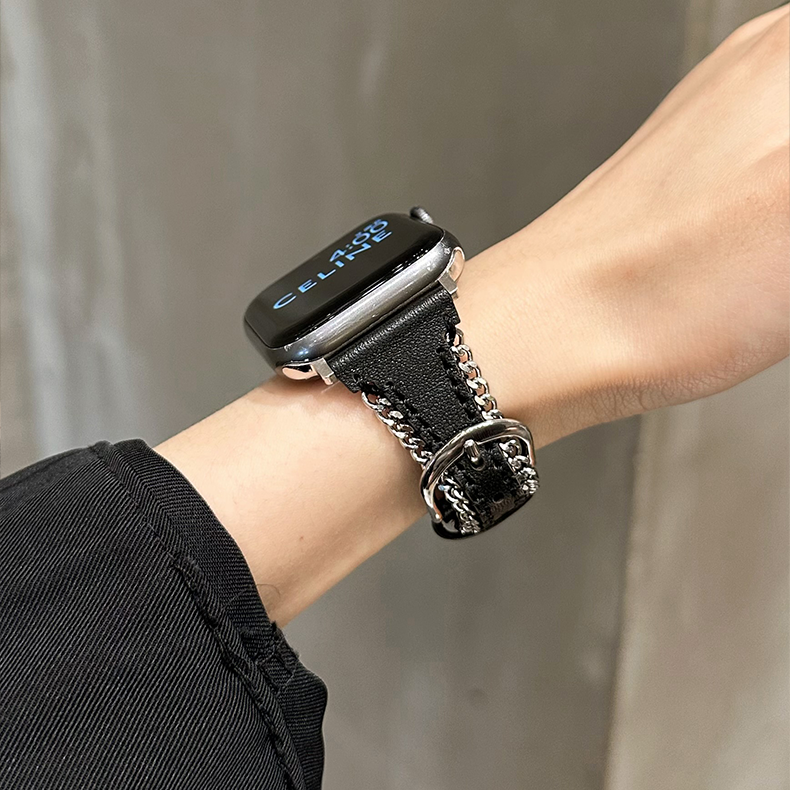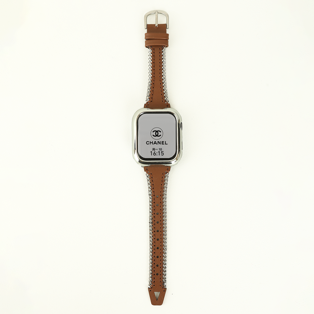 Crafted from full-grain cowhide and calf leather, this Apple Watch band features a silver metal chain, hollow leather design, and a horseshoe buckle, offering a sleek and youthful aesthetic.