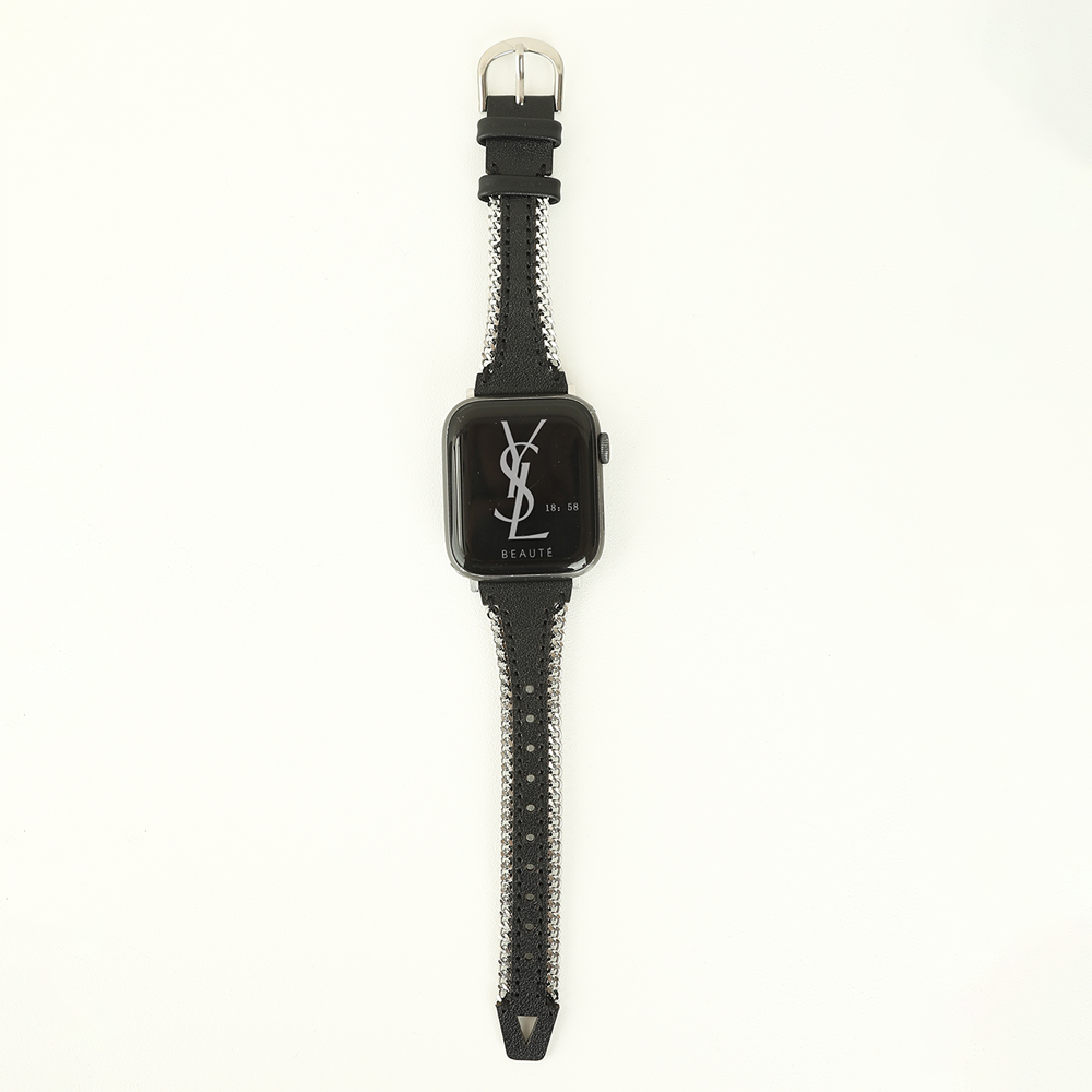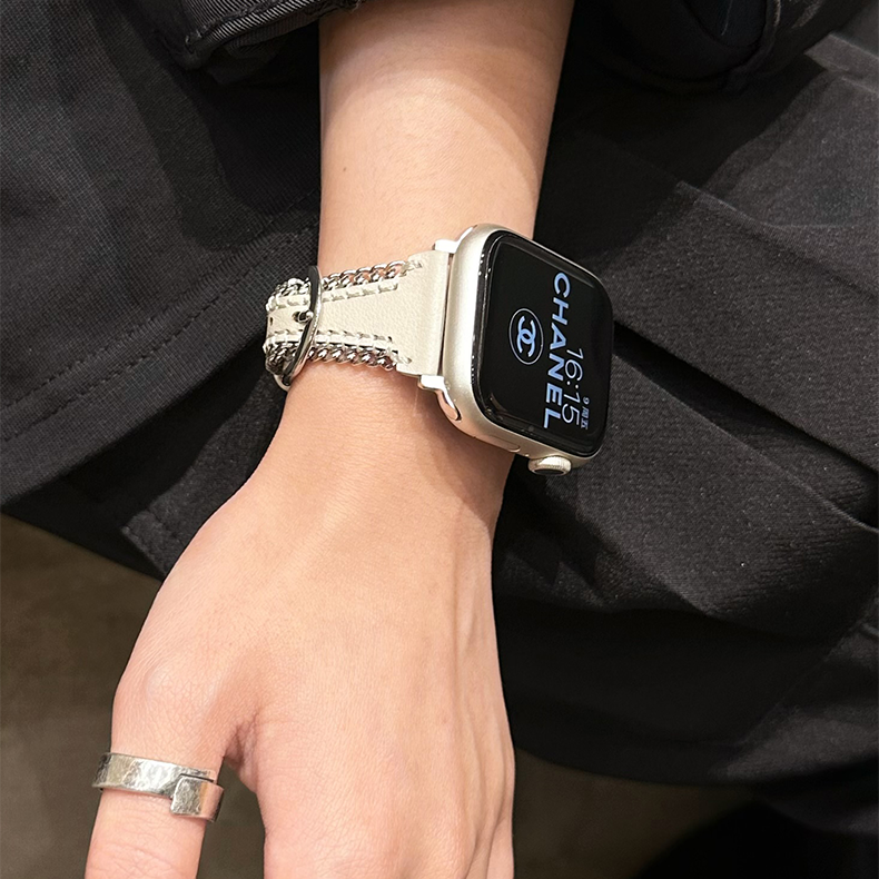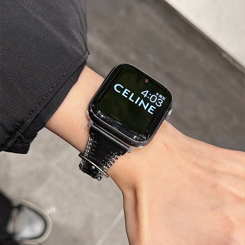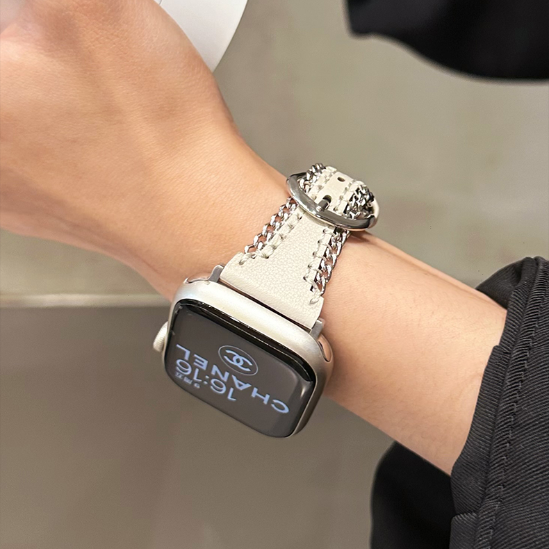 Crafted from full-grain cowhide and calf leather, this Apple Watch band features a silver metal chain, hollow leather design, and a horseshoe buckle, offering a sleek and youthful aesthetic.