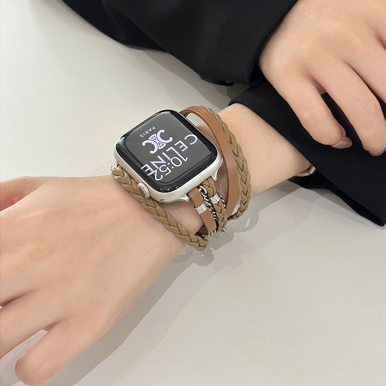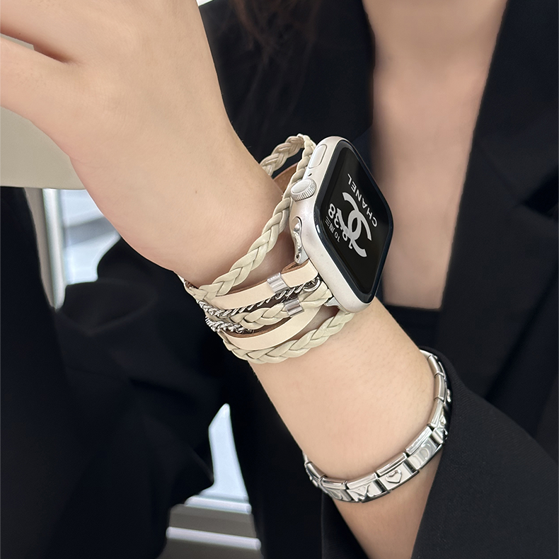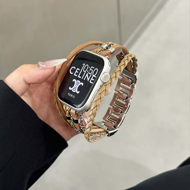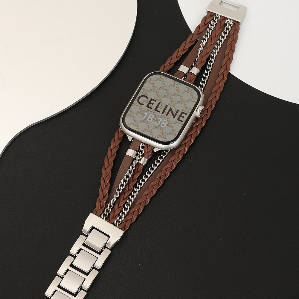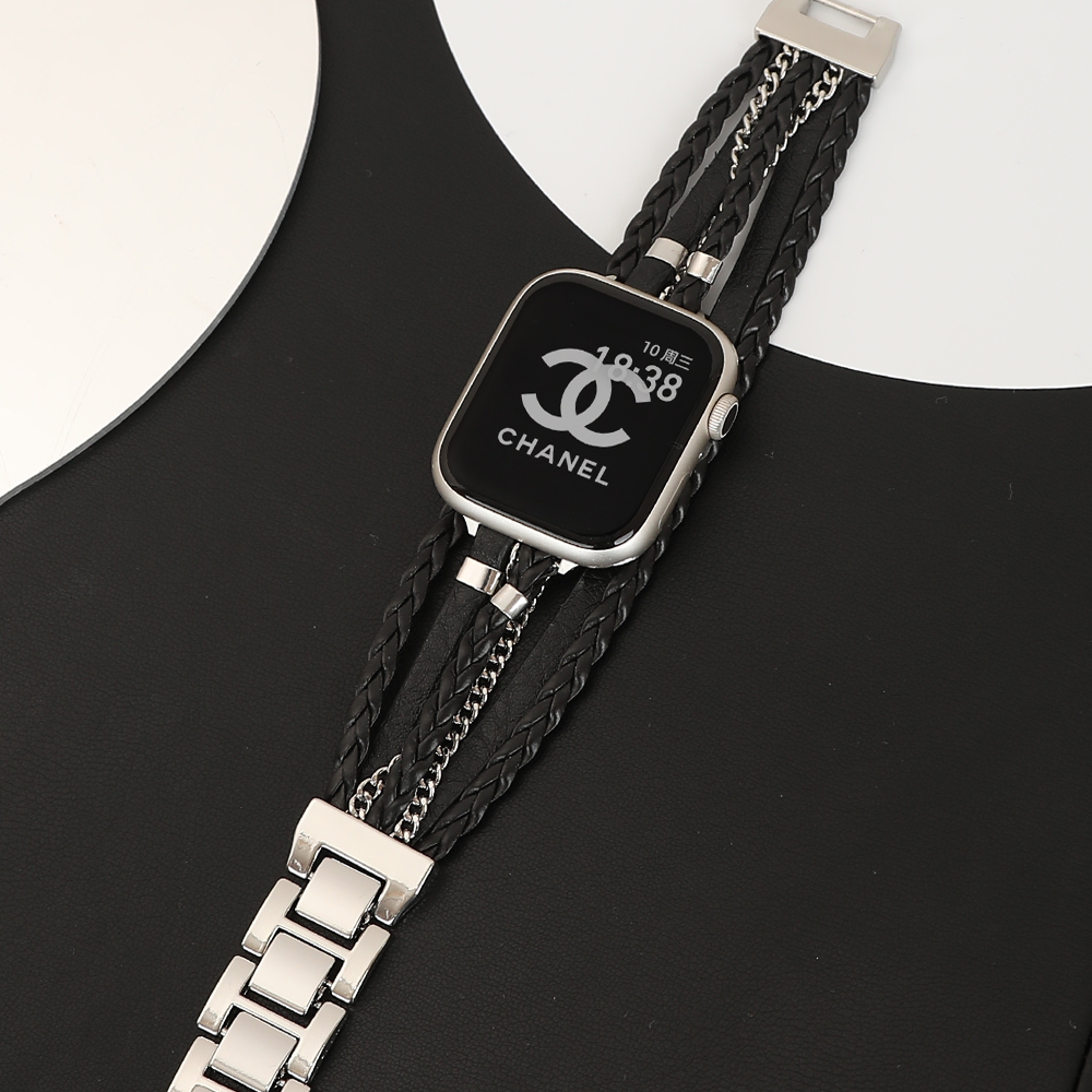 This Apple Watch band combines woven PU leather with silver metal chain, offering a chic and stylish look. Featuring a removable clasp, polished metal accents, and smooth rounded edges, it adds a modern twist to any outfit. Ideal for those who appreciate on-trend accessories with unique details and a minimalist design.